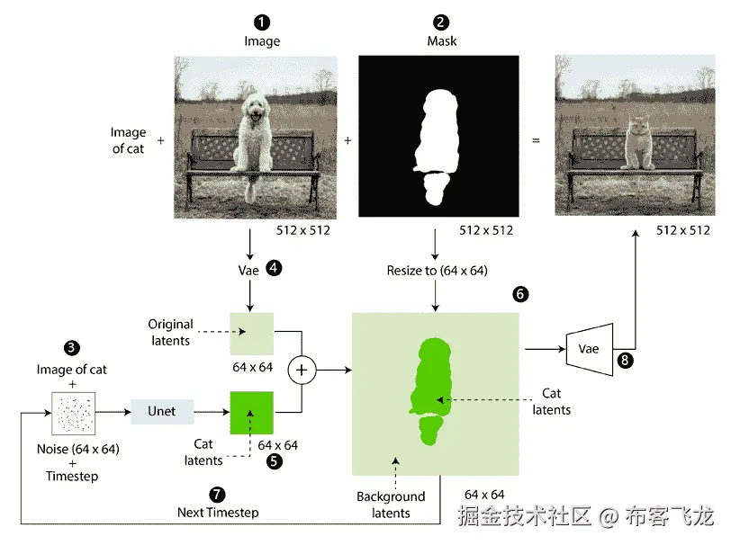 获取原始的潜变量(在步骤 4中获得)、调整大小的掩模(在步骤 2中获得)和潜变量(在步骤 5中获得)以分离背景潜变量和与掩模区域相对应的潜变量。实质上,这一步中的潜变量计算为