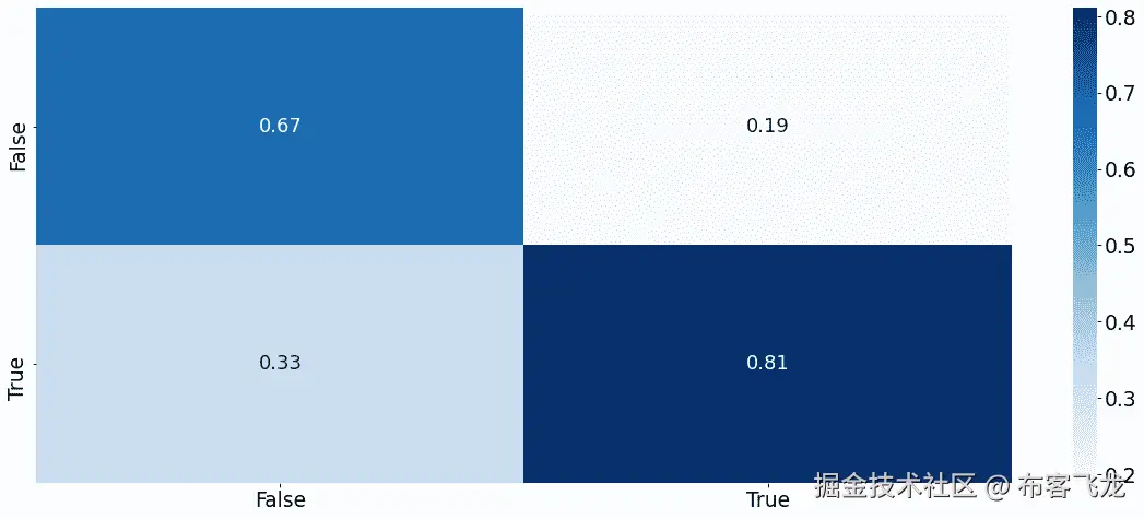 这个混淆矩阵列出了对实际违约的预测。在点对角线上,假-假和真-真是正确的预测(真正例和真反例)。我们可以看到,正确预测的数量比错误预测高,这让人感到安慰。