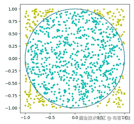 - 绘制所有随机点,并对圆内的点使用不同的颜色: