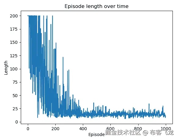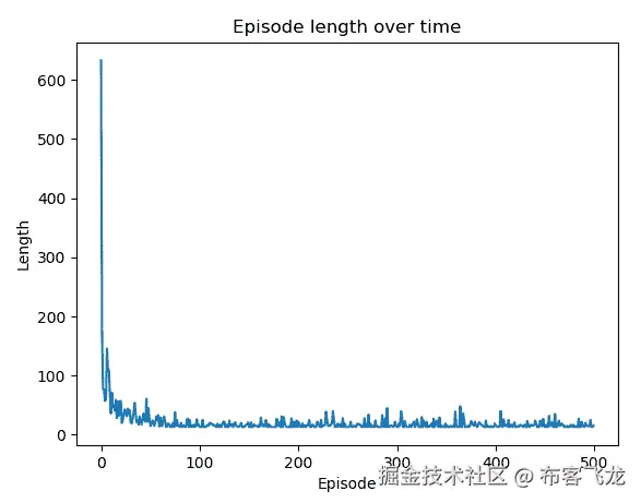 在第 6 步之后,您可以绘制每个周期的长度和总奖励,以验证模型是否收敛。周期长度随时间的变化图如下所示: