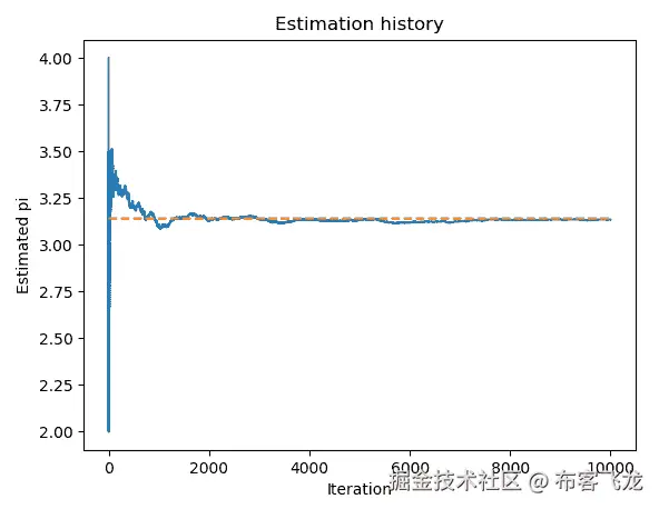 我们可以通过比 1,000 次更多的迭代进一步改进我们的估计。在这里,我们将尝试 10,000 次迭代。在每次迭代中,我们在正方形内随机生成一个点,并检查它是否在圆内;根据落入圆内的点的比例,我们即时估算π的值。