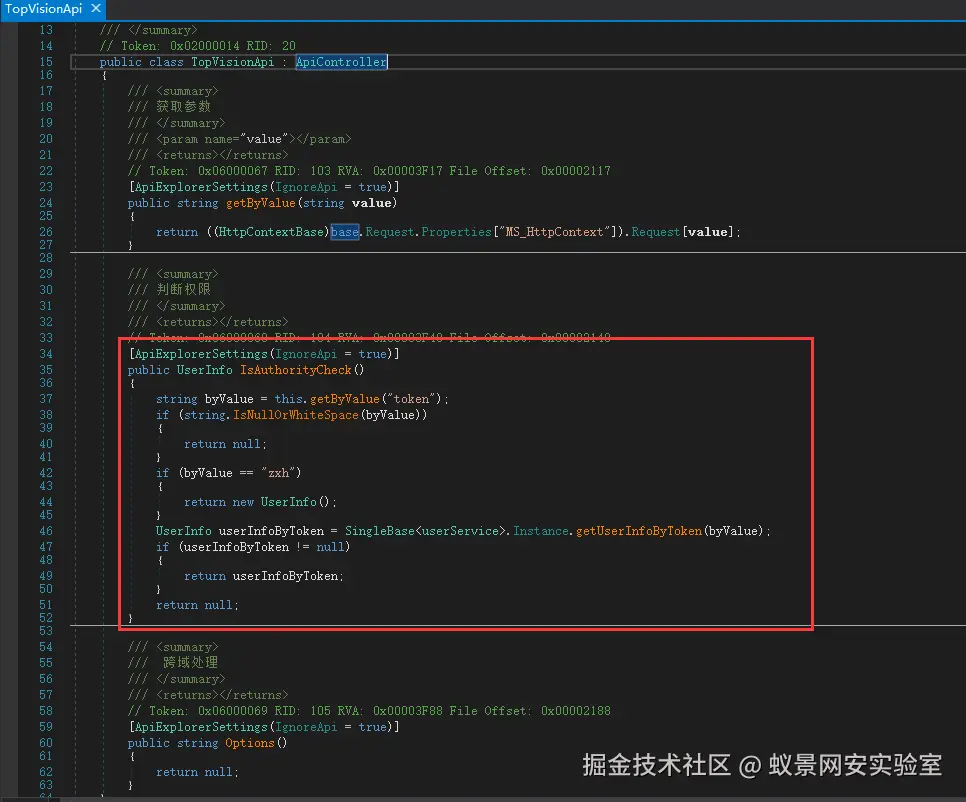 然后回到filesController的身份判断,发现只判断了IsAuthorityCheck返回是否为null,所以只需要让token参数是zxh的时候,那么就可以绕过身份校验了。