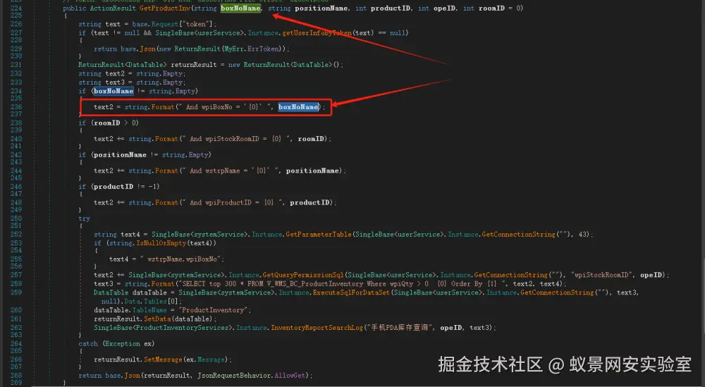 InventoryController的GetProductInv方法,直接从参数获取boxNoName未经过过滤直接通过string.Format拼接至sql语句中,导致了sql注入。