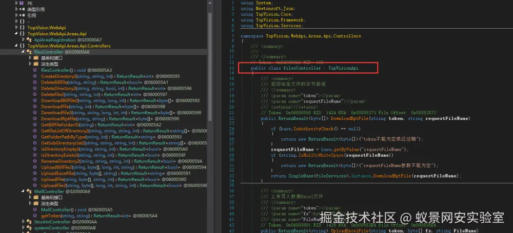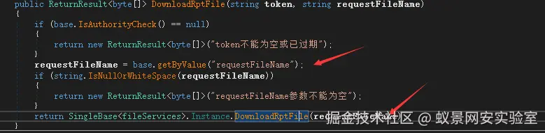 还是 filesController 这个控制器 DownloadRptFile方法。这时我们已经绕过了身份认证,所以只需要看之后代码即可。requestFileName就是我们传递的http参数,