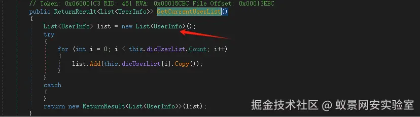 发现GetCurrentUserList方法查询了所有用户信息。并且返回给前台。