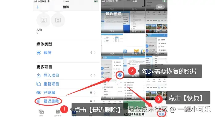 第2步:在【更多项目】下面,找到 【最近删除】 打开,就可以发现被删除的视频,下滑找到不小心删除的视频,点击右下方的 【恢复】 就能重新回到相册里啦!