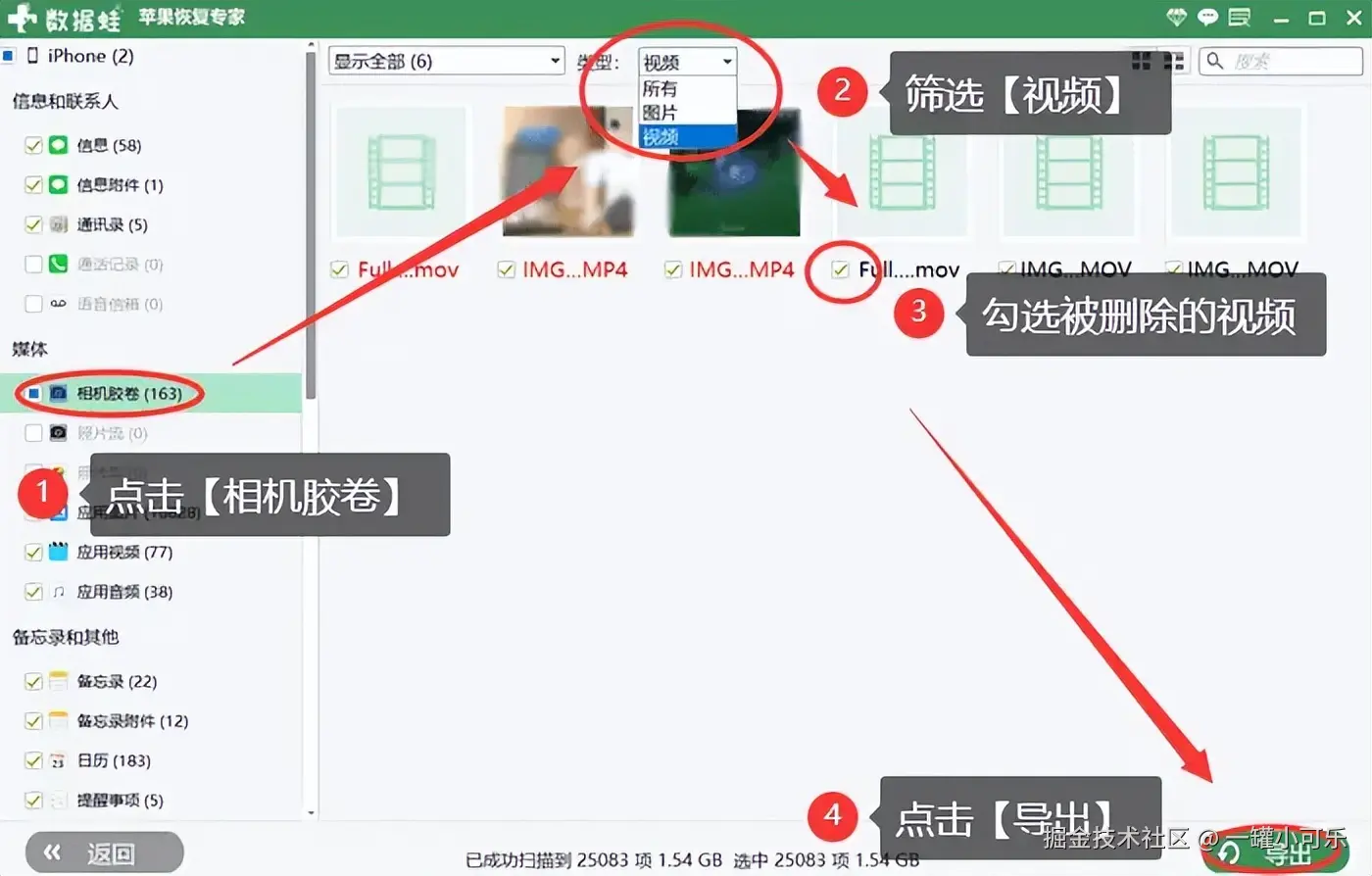 第3步:等待扫描完成后,点击 【相机胶卷】 ,预览手机的照片和视频,要恢复丢失的视频的话,在界面上方选择 【视频】 筛选即可,勾选需要恢复的视频,点击 【导出】 即可。