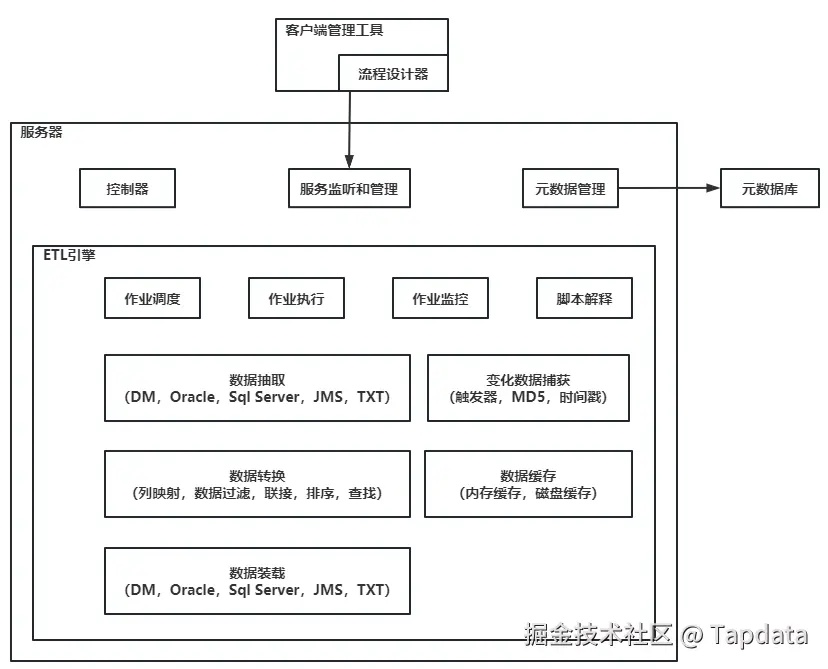 支持二次开发接口,比如数据源的抽取装载接口、数据转换接口、元数据存取接口等