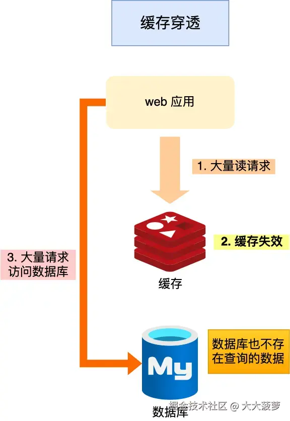 当用户访问的数据,既不在缓存中,也不在数据库中,导致请求在访问缓存时,发现缓存缺失,再去访问数据库时,发现数据库中也没有要访问的数据,没办法构建缓存数据,来服务后续的请求。那么当有大量这样的请求到来时,数据库的压力骤增,这就是缓存穿透的问题。