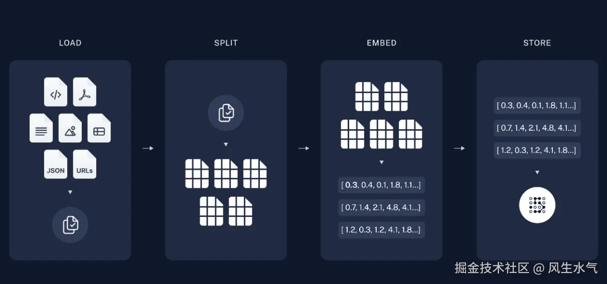 构建索引的过程需要将外部的非结构化数据转换成向量表示并存储到向量数据库中。对于比较大的文件内容,我们首先还要对其进行分块,以适应LLM上下文的大小。转换之后的文本内容是一个高维的向量,具有相同语义的文本在高维空间中具有更高的相似度,通过这种方式来实现语义检索。