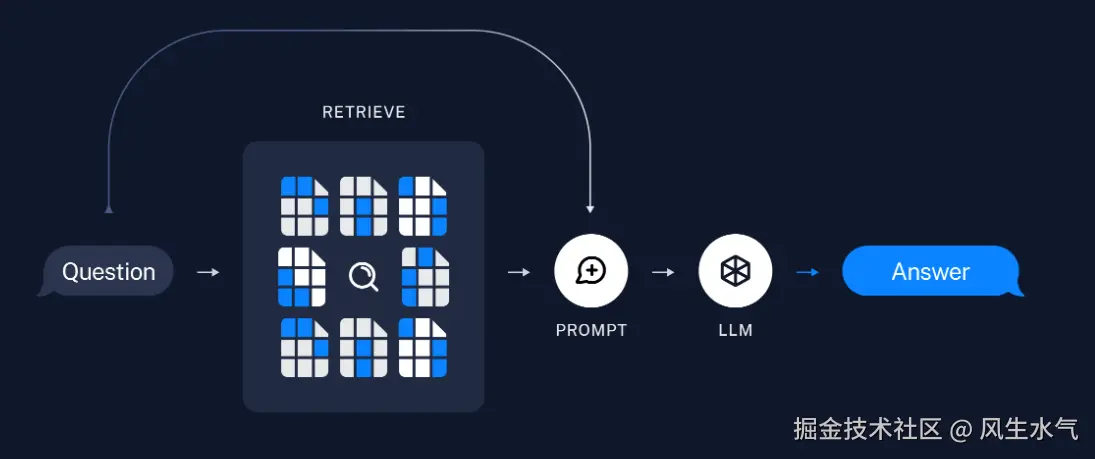 检索过程中,需要根据用户的问题进行检索。在这个过程中,检索器会根据用户的输入找出符合用户意图(简单实现即语义相似)的内容,将这部分内容作为上下文和用户问题一起组成prompt,并输入LLM, 由LLM处理并给出最终回复。