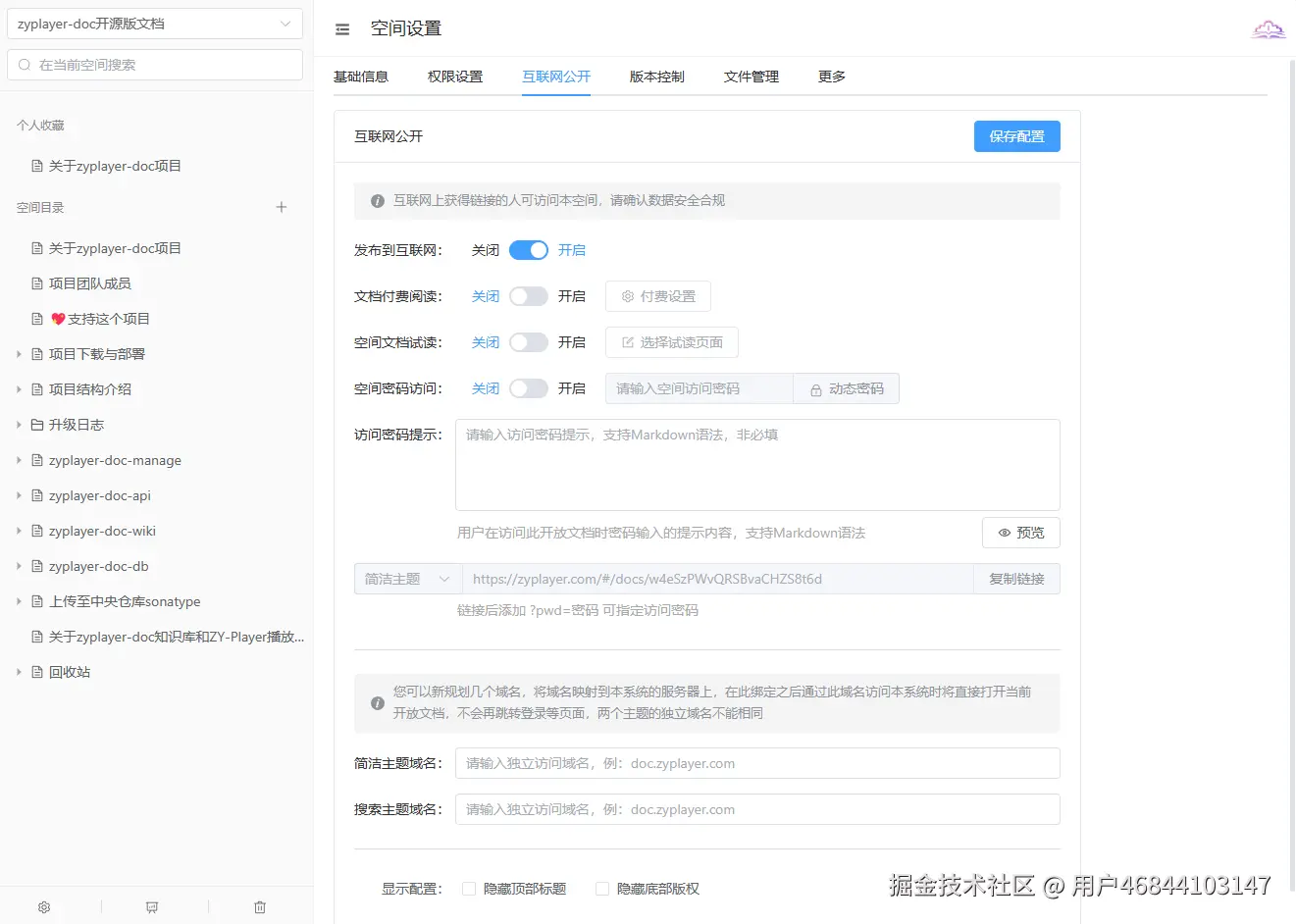 在空间设置页可将编写的文档发布至互联网,发布后获得链接的用户均可访问该空间内的文档,可用于企业产品文档、知识分享等场景使用。