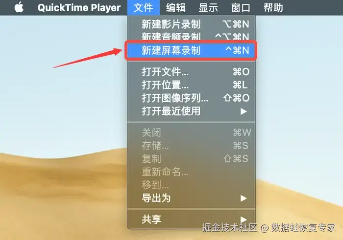 步骤2:点击 【文件】 并选择 【新建屏幕录制】 ,也可以通过快捷键 【^⌘N】 来打开录制功能。