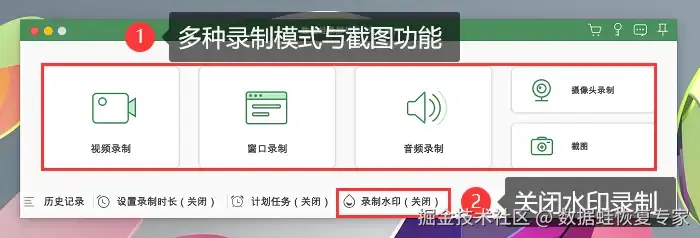 步骤1:下载并安装Mac版本的数 据 蛙录屏软件到您的电脑上。进入首页,您可以根据需求选择不同的录制模式,录制屏幕视频推荐使用 【视频录制】 模式。如果需要进行高清录制,可以选择关闭水印进行录制。