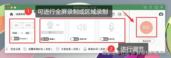 步骤2:在 【视频录制】 界面,可以选择进行全屏录制或者选择区域录制,对摄像头和声音等进行调节。数据蛙录屏软件也同样具备快捷键录制的功能,您可以使用快捷键 【^⌘S】 进行快速录制,也可以点击 【REC】 按钮进行录制。