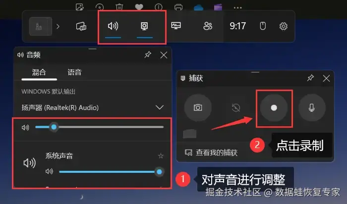 步骤:在键盘上按下 【Win+G】, 调出Xbox Game Bar录屏,设置好录制声音后,点击 【圆形】 录制按钮即可进入录屏。