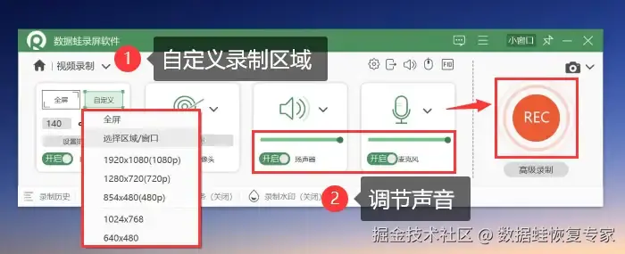 步骤3:在常规的 【视频录制】 中,我们可以先调整好录制的区域和录制的声音等,然后点击 【REC】 即可进入录屏。