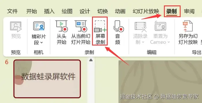 步骤:点击ppt文稿上方的 【录制】 ,选择 【屏幕录制】 ,框选PPT文稿,进行录制。