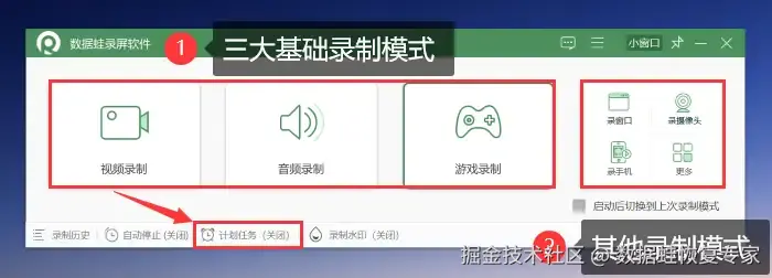 步骤2:进入软件的主页,可以根据您的需求选择不同的录制模式。电脑录屏多使用 【视频录制】 模式。需要进行计划任务的可以点击左下方 【计划任务】 进入设置,设置好录制任务,时间一到将为您开启自动录屏和停止录屏。