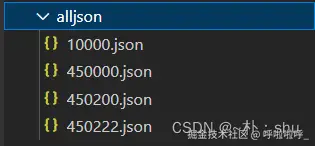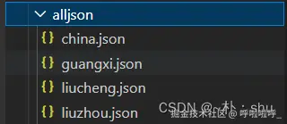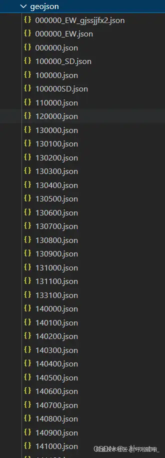 实现的效果跟上面是一样,这样设计的原理是 所有adcode都是事先定义好的,不需要人为修改。因此,项目中经常会看到类似下图的json文件列表: