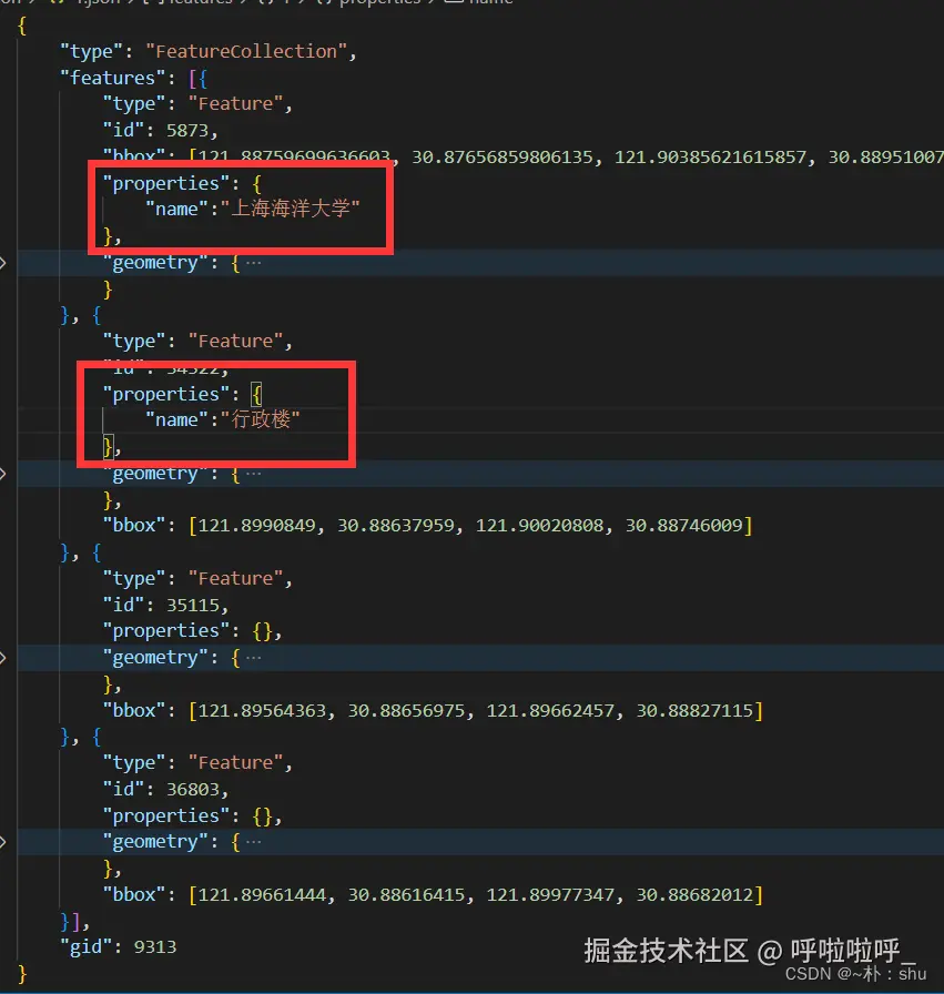 两个面、两条线,4个features,在每一个properties中添加name属性: