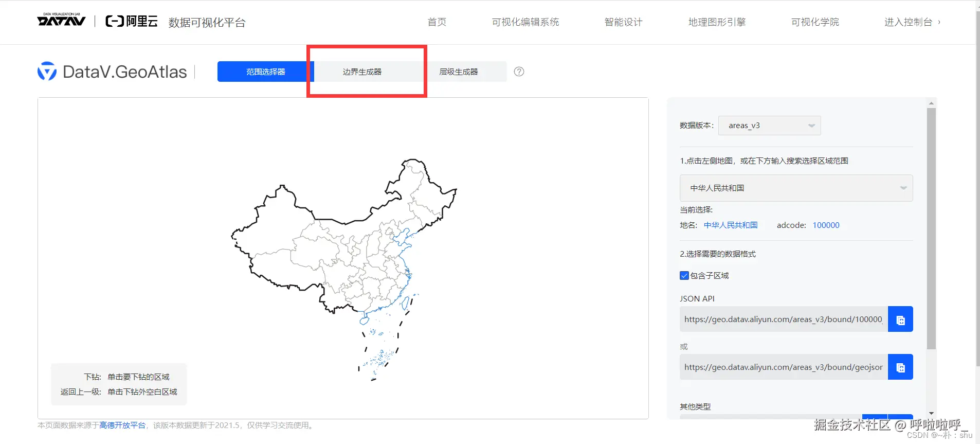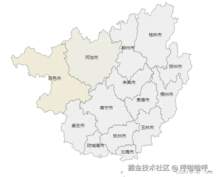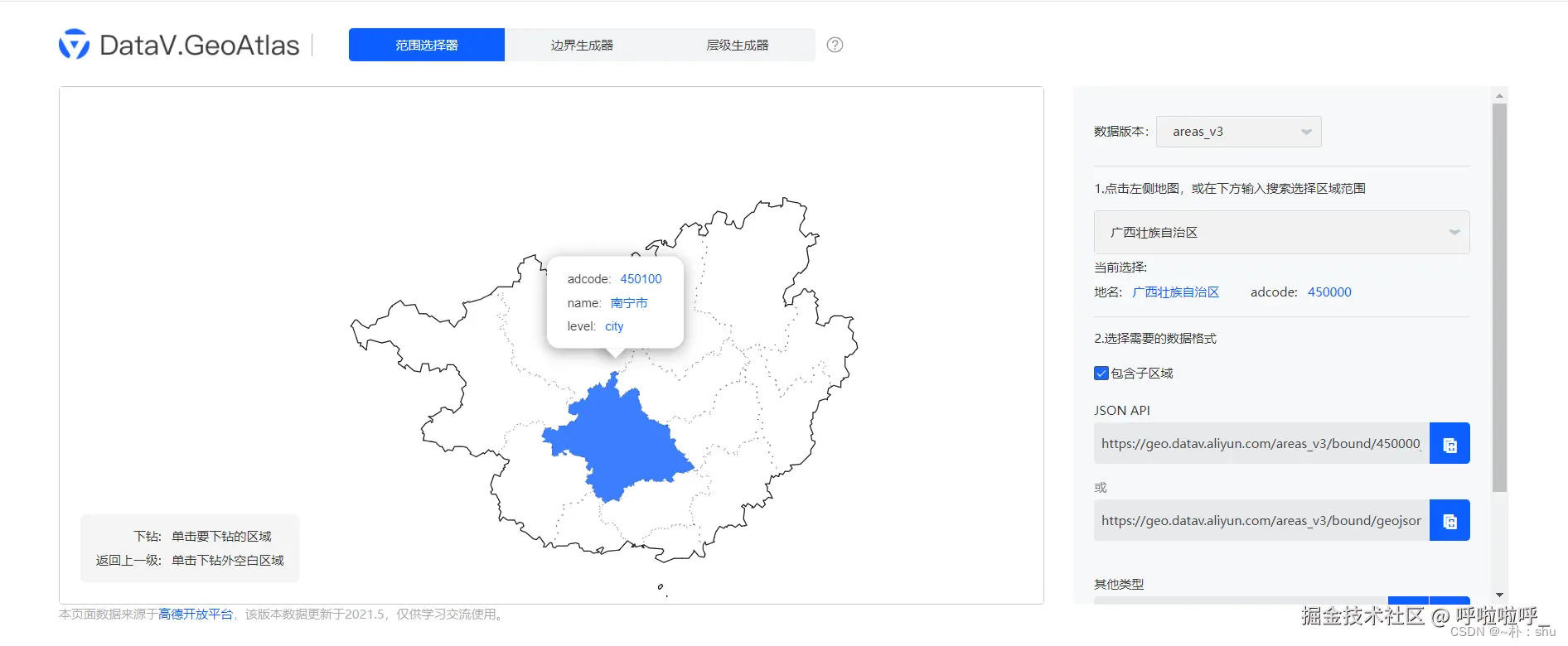 左侧是地图,右侧是JSON数据路径,点击你想要生成的地图省市、地级(以广西省为例);