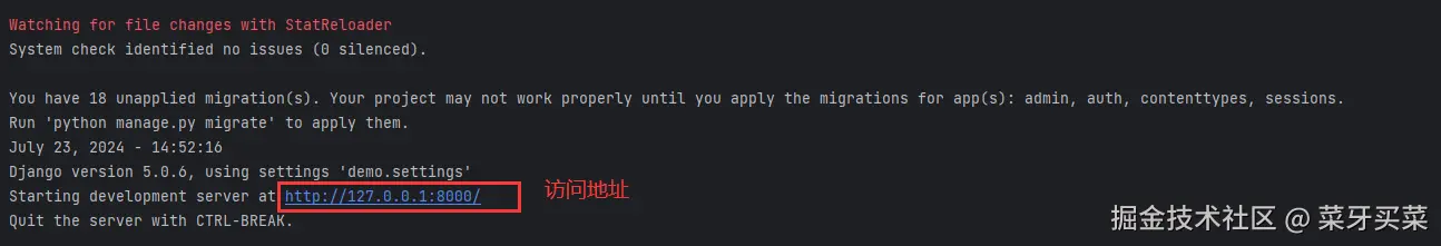 在项目所在文件夹中打开终端,输入如下命令即可创建Django项目,demo是项目名称,可以根据需要自行修改