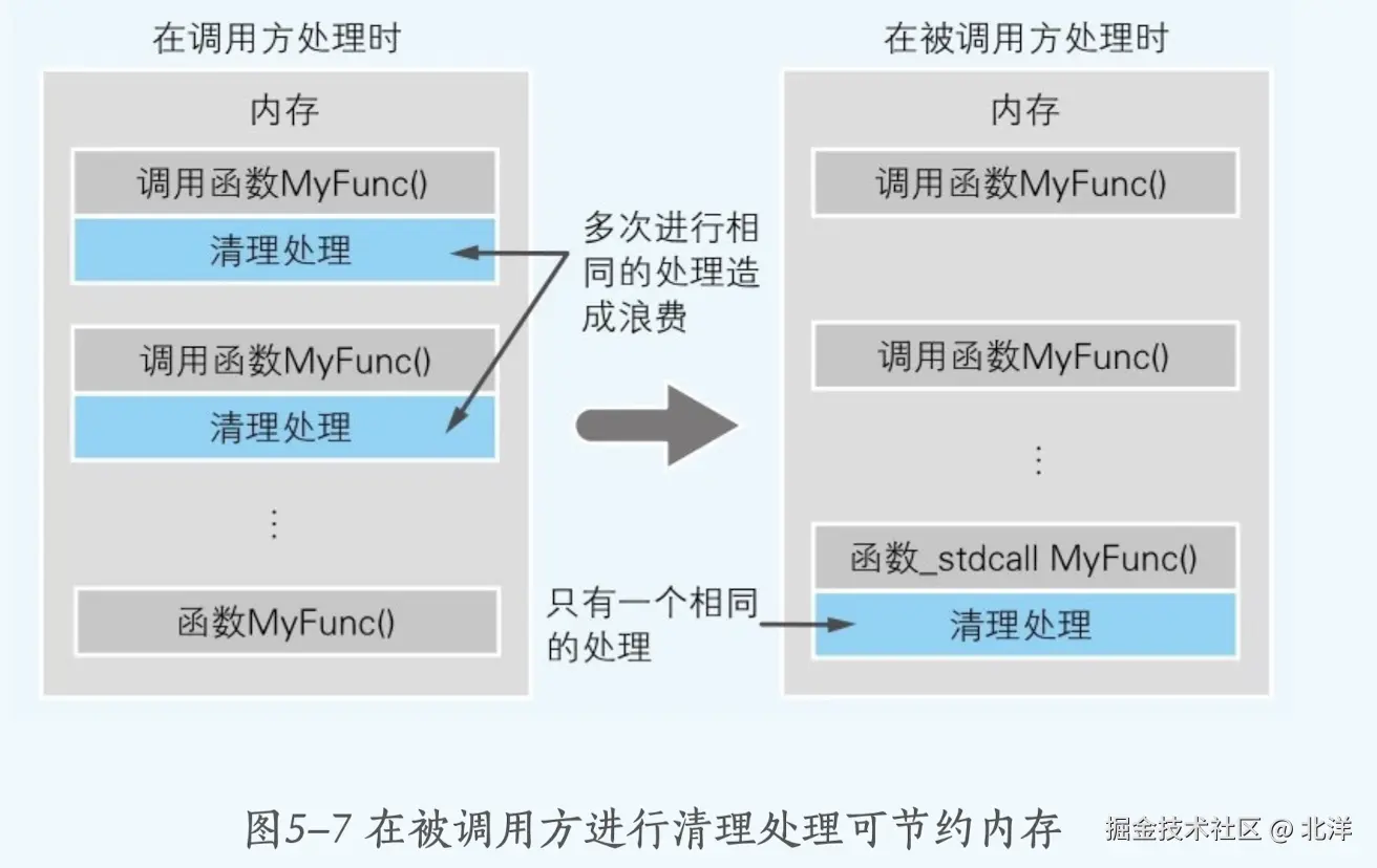 清理参数的代码 是编译器在编译期间 自动添加的,对于多个调用同一函数的 调用处 都会 进行添加清理代码,这也是一个代码空间对浪费。