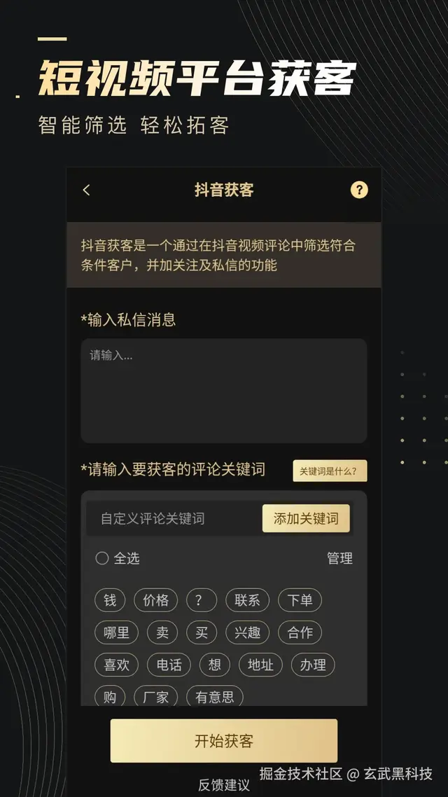 (1)短视频平台获客,涵盖了某音、筷手、小红薯等主流平台,智能筛选,轻松拓客
