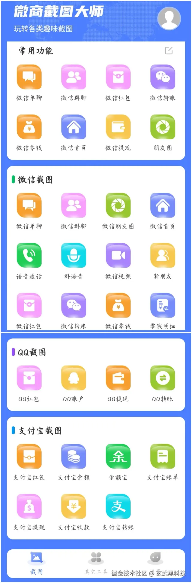 (1)软件首页,覆盖了微信截图、QQ截图、支付宝截图等主流平台转账、聊天、钱包余额的截图任意设置及修改