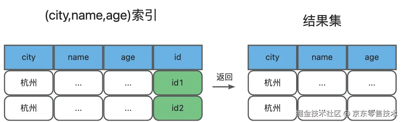 你是不是觉得到此为止了?还可以再优化下哦,如果创建一个(city,name,age)的联合索引,那么这个联合索引对于这个SQL来说就成了覆盖索引,流程简化成了这样: