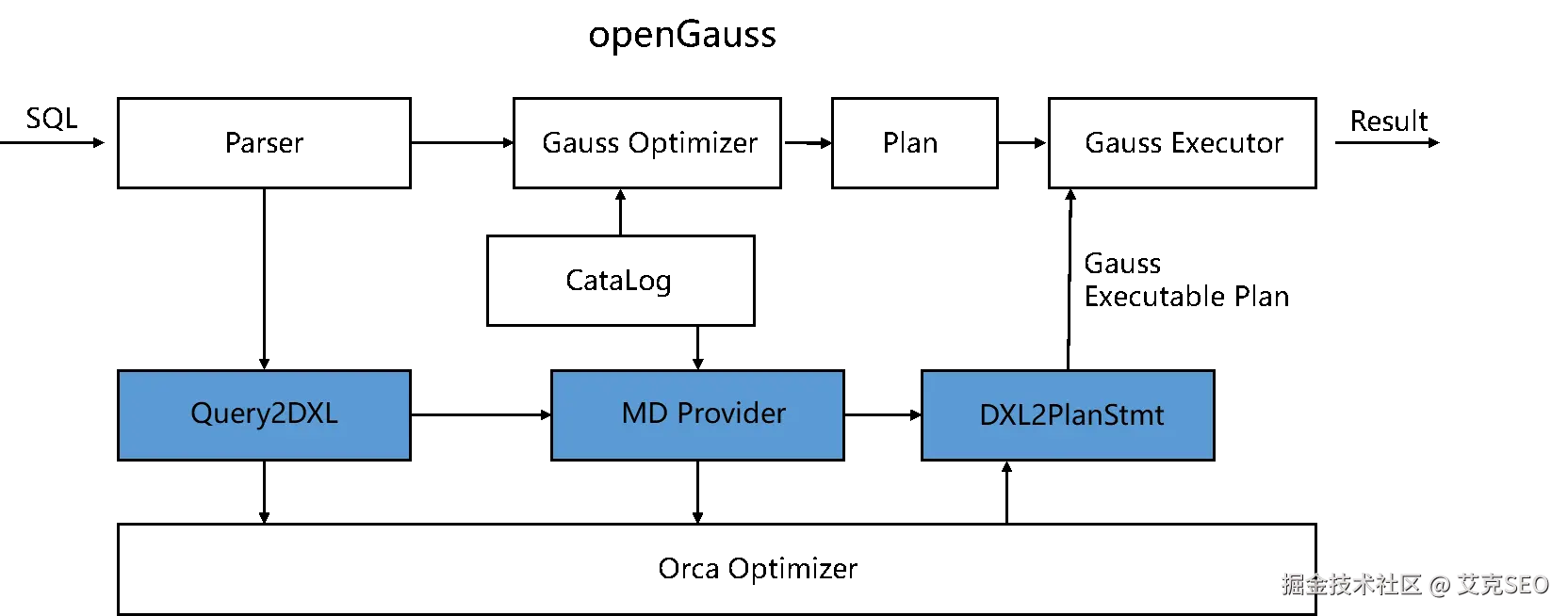 使用GreenPlum社区研发的开源组件GPORCA优化器,对其适配openGauss生成多机执行计划,适配后的组件以动态库的方式被openGauss多机查询调用。 由于ORCA本身已模块化,输入、输出均接口化,在适配时,我们仅对下图蓝框部分做相应适配逻辑,核心改动包含: