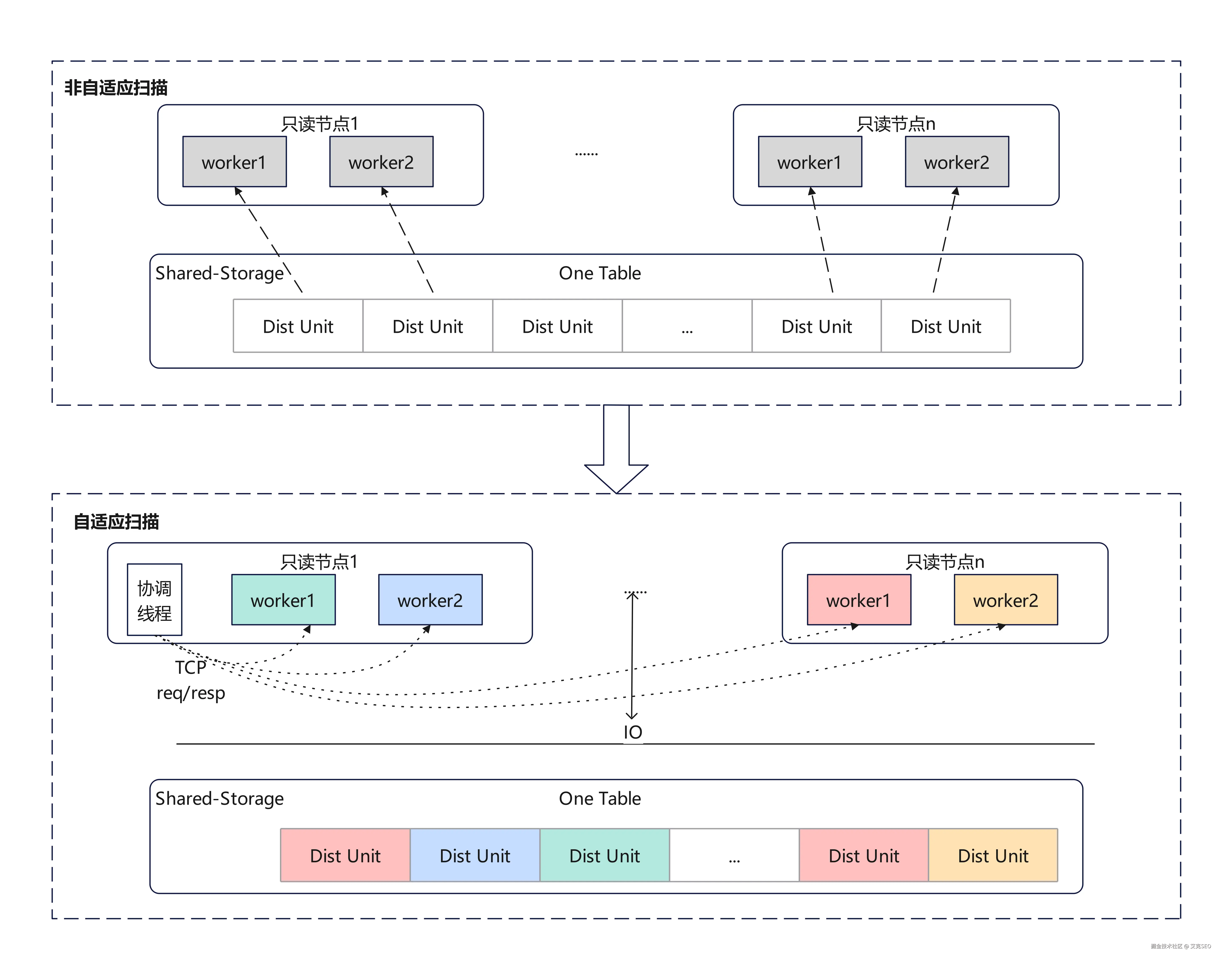 - 自适应扫描:SPQ设计实现自适应扫描机制,不再限定每个Worker扫描特定的ID。 采用 请求-响应(Request-Response)模式,通过QC进程与QE Worker进程间的特定RPC通信机制,由QC进程负责告知每个Worker进程可执行的扫描任务,从而消除计算数据倾斜的问题。