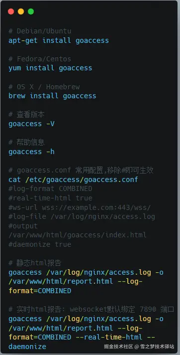 然后利用同样的方法可以获取GoAccess配置文件位置,最后再通过命令行输入goaccess -f /var/log/nginx/access.log,GoAccess将读取并分析指定的日志文件。