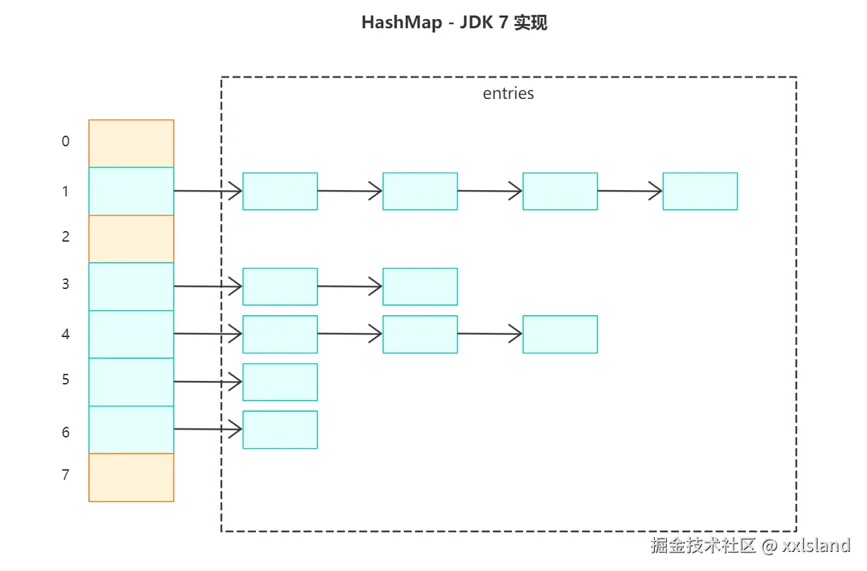 - 数据结构:数组 + 链表 + 红黑树