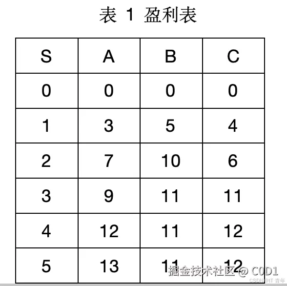 表1中第一列S为机器数,A、B、C三列表示3个工厂在拥有不同台数的机器时的盈利值。 输出结果为:第一行为三个整数(输出宽度为4,左对齐),分别表示三个工厂得到的机器数量。 第二行为一个整数(输出宽度为4,左对齐),表示获得的总利润。