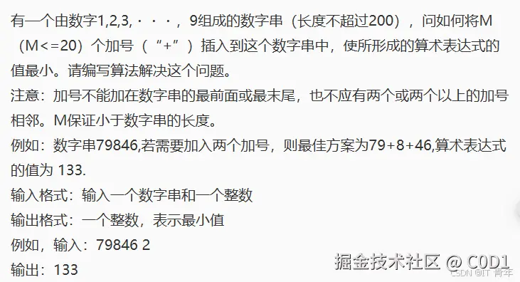 然后使用两个循环来更新dp数组。外层循环遍历数字串的每个数字,内层循环遍历插入的加号个数。对于每个dp[i][j],可以考虑将数字nums[i]与前面的数字组合成一个新的数,或者将数字nums[i]与前面的数字之间插入加号。取两种情况中的较小值作为dp[i][j]的值。