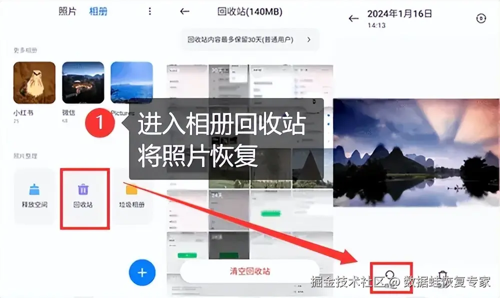 有些安卓手机系统自带了 “回收站” 功能,类似于电脑中的回收站。当你删除照片时,它们并不会立即被永久删除,而是先被移入回收站。在一段时间内 (通常为30天) ,你可以随时打开回收站,将照片恢复到原位。因此,在尝试其他方法之前,不妨先打开手机的回收站看看是否有幸运的发现。