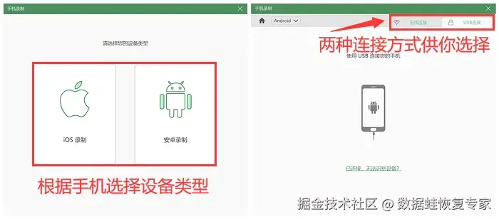 第三步:软件支持录制iOS系统和安卓系统的手机,您可以根据手机系统进行选择。在连接方式中,您可以选择 【无线连接】 或 【USB连接】 ,按照屏幕上的步骤提示将手机与电脑连接在一起。
