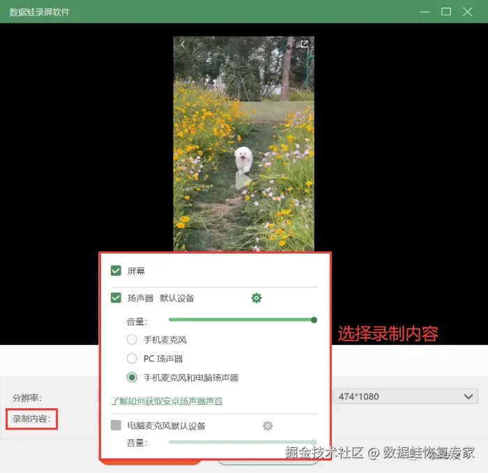 第四步:连接成功后,设置需要好录屏的输出分辨率和录制内容,点击 【录制】 按钮开始录制。