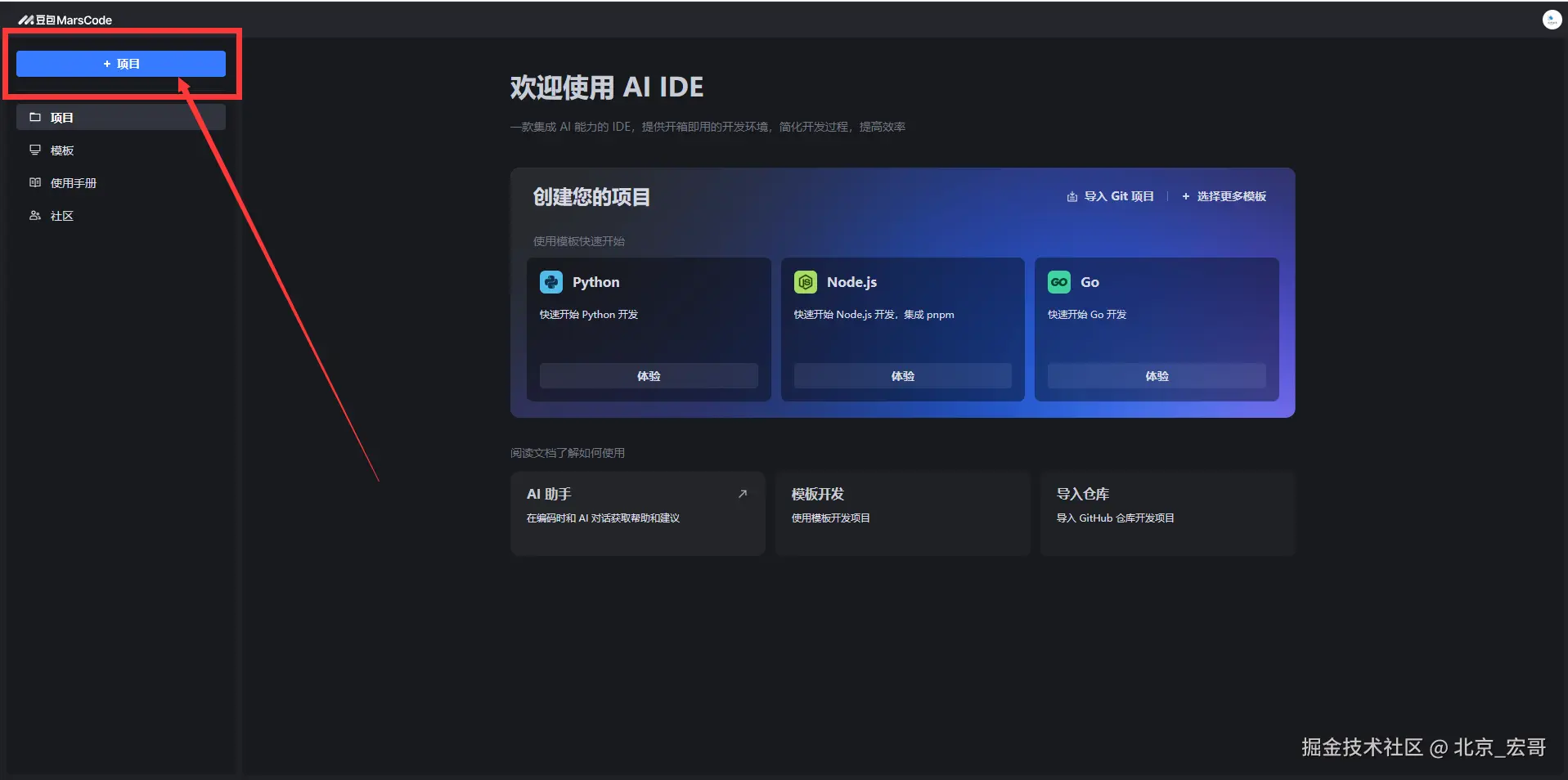 1.登录上豆包MarsCode,点击左上角的“+项目”按钮。如下图所示: