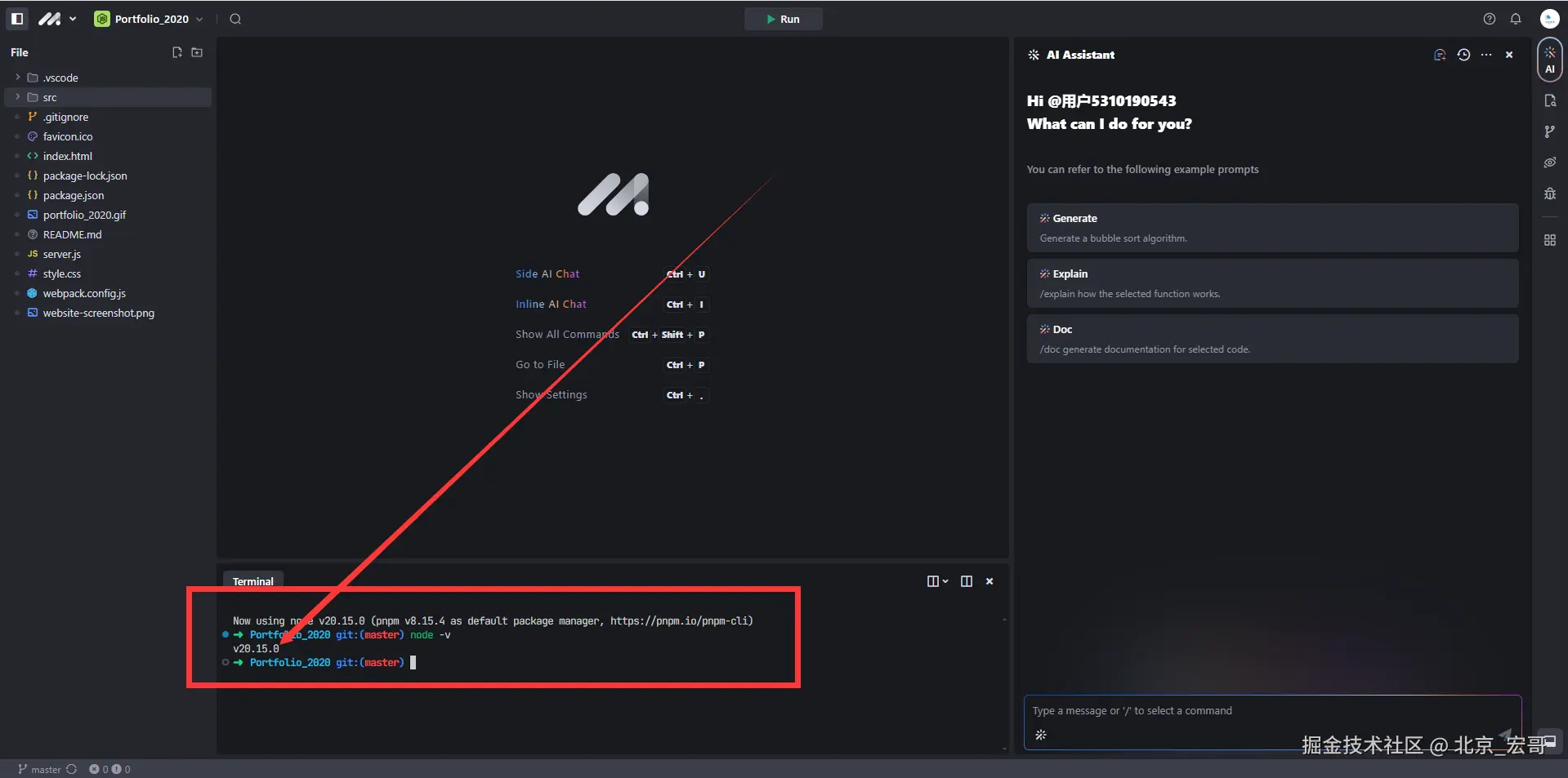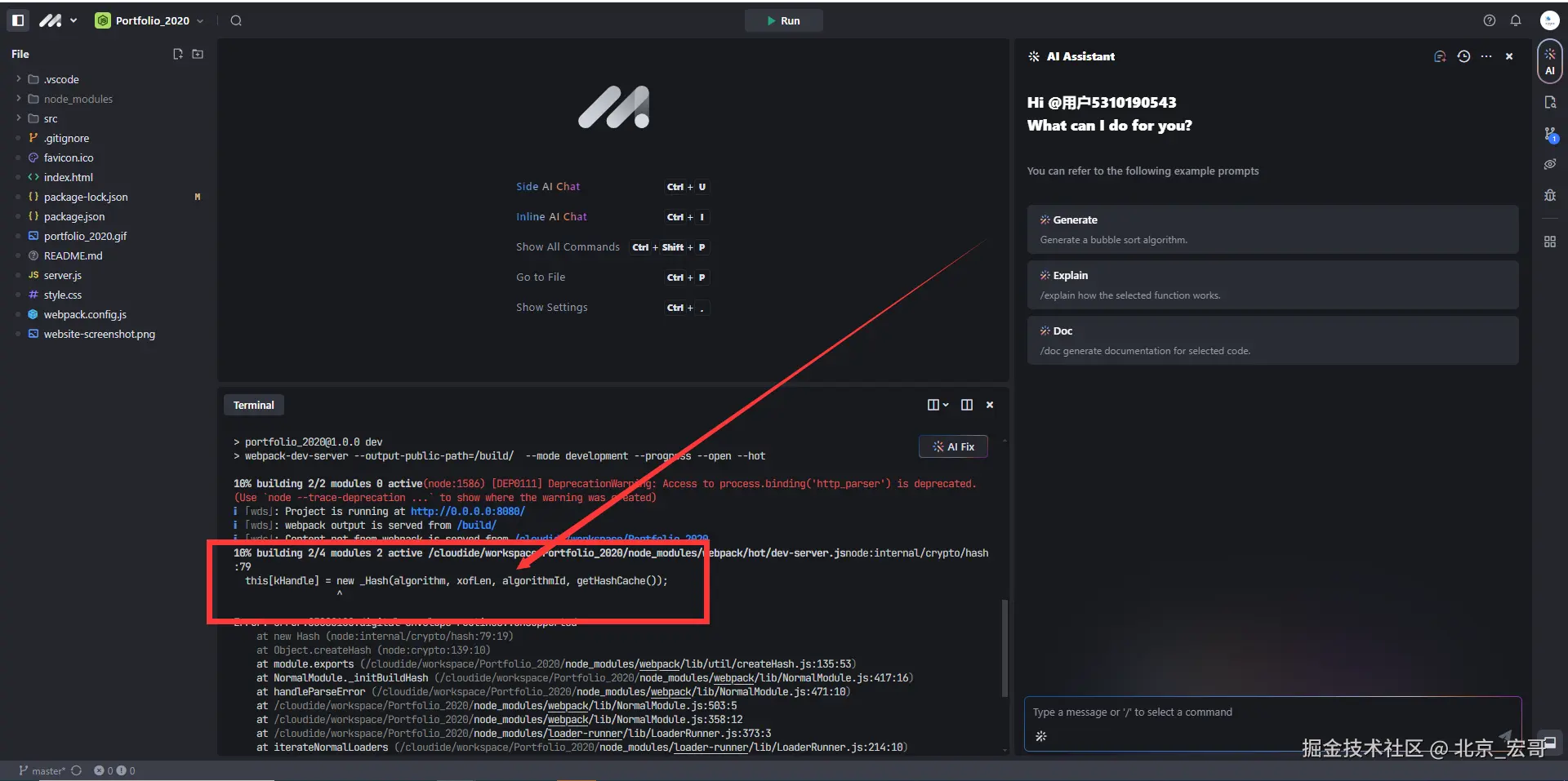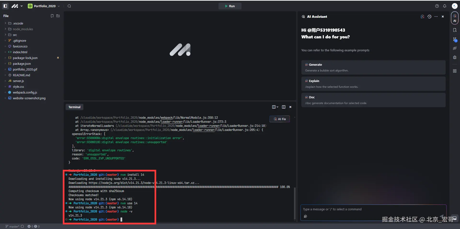 宏哥一看,这怎么搞呀,两个角度:一个是需要修改代码,适应高版本的node,另一种办法就是降低node版本,但是AI IDE的集成开发平台没有提供可以选择node版本,宏哥就抱着试一下的心态,没有想到竟然可以,那这样看来就比较灵活了,你自己可以选择安装代码运行的node版本。