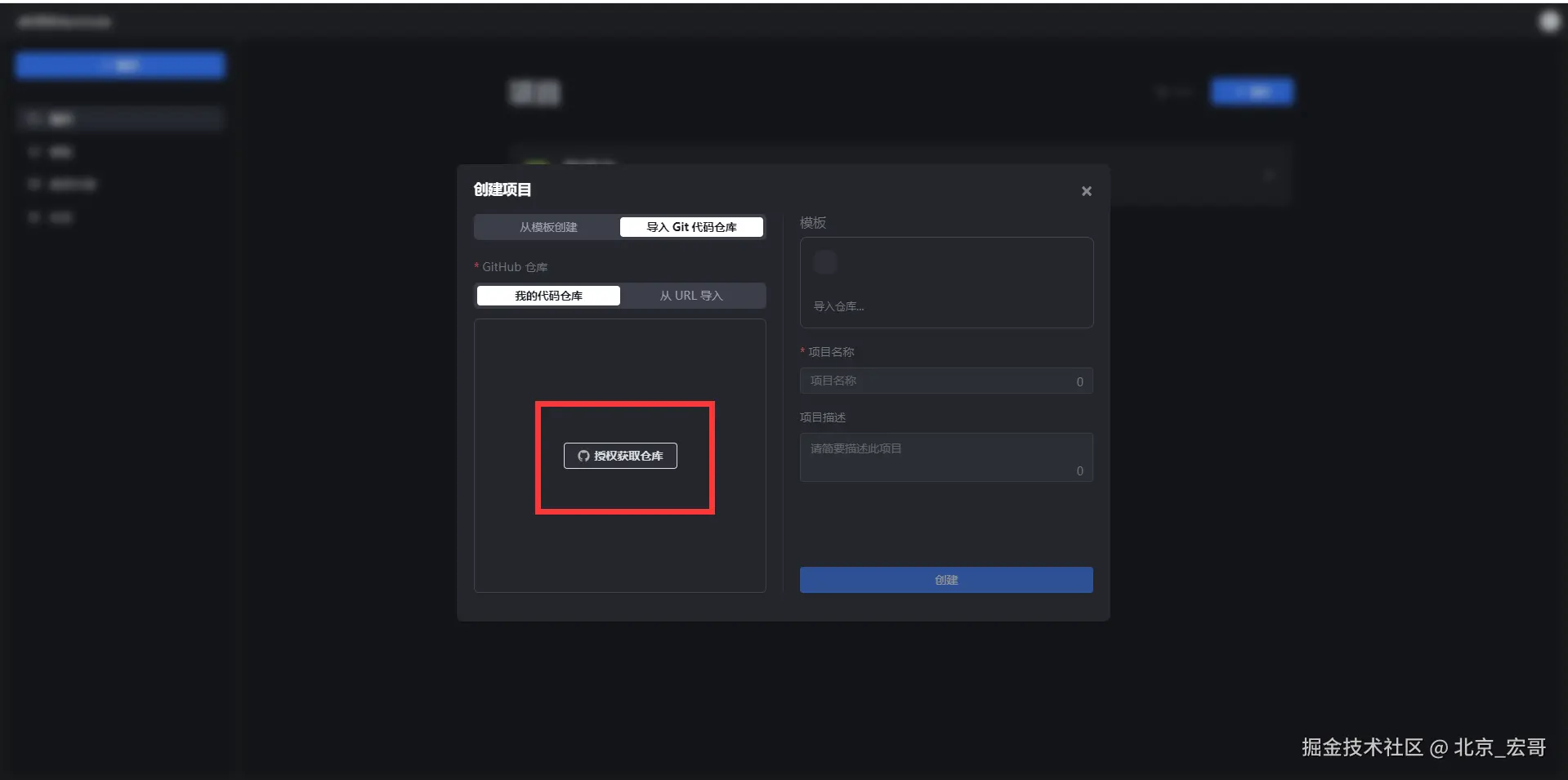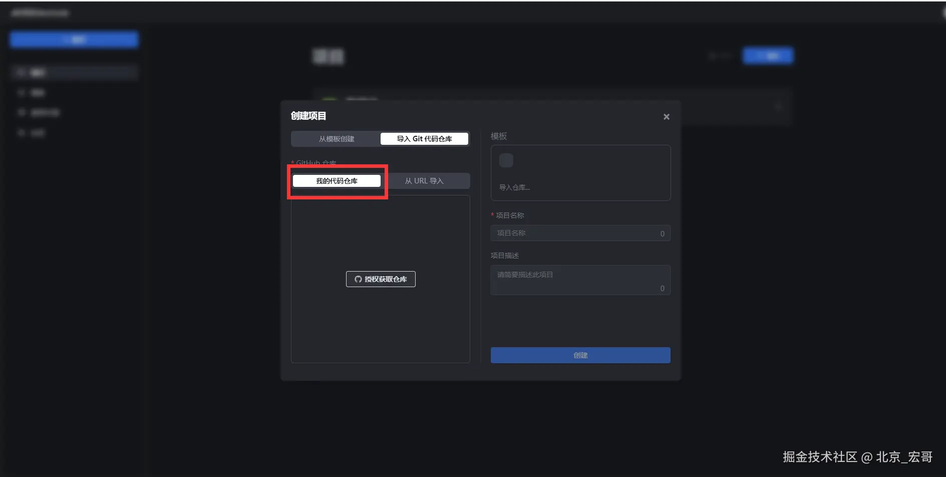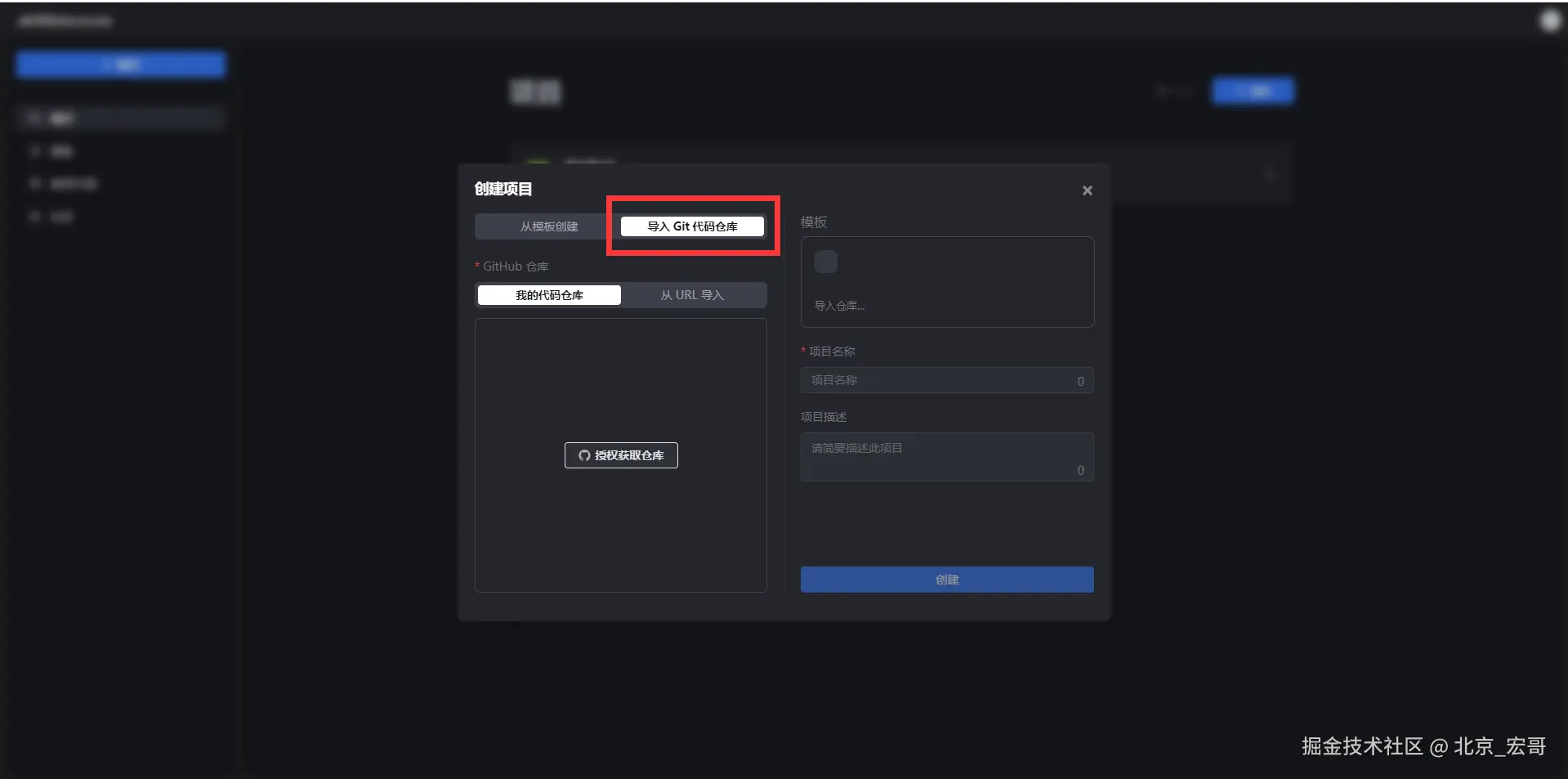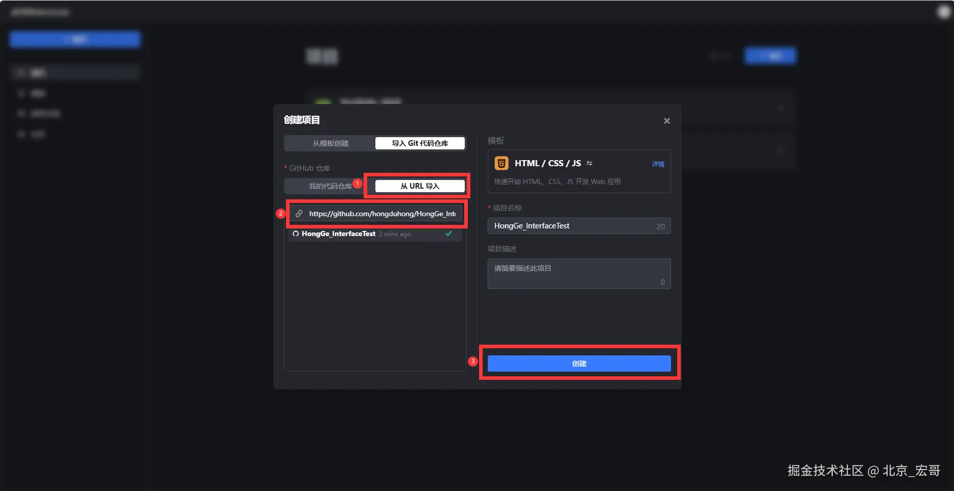9.我们通过选择“从URL导入”,填写GitHub仓库地址,点击“创建”按钮,如下图所示: