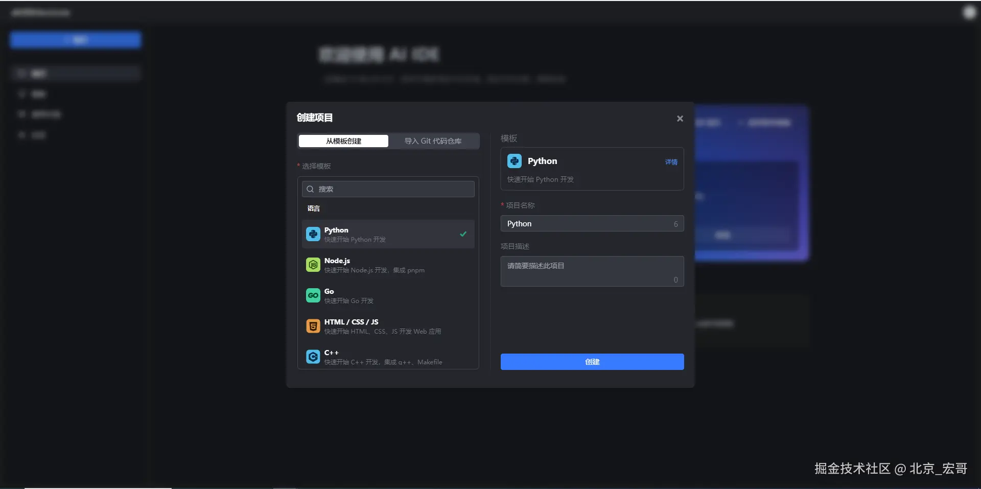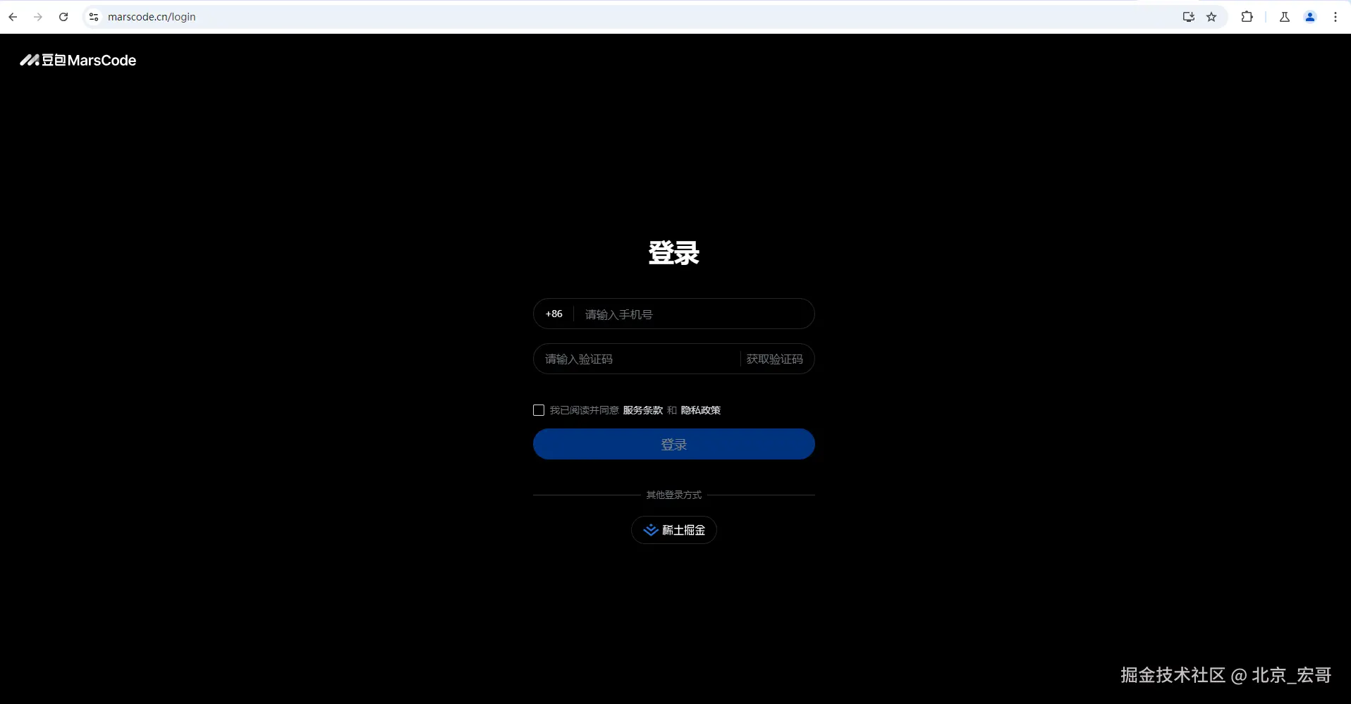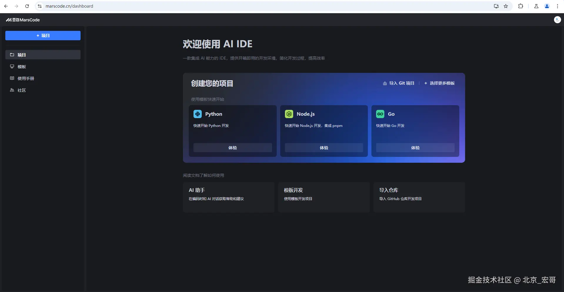 1.首先,我通过提供的链接 sourl.cn/vKjHKF 成功注册了豆包MarsCode平台。豆包MarsCode作为一个集成开发环境(IDE),提供了丰富的编程资源和便捷的云开发体验,非常适合快速搭建和测试项目。在注册并登录后(这里比较简单宏哥就不赘述了),宏哥这里直接用稀土掘金的账户,直接关联登录,如下图所示: