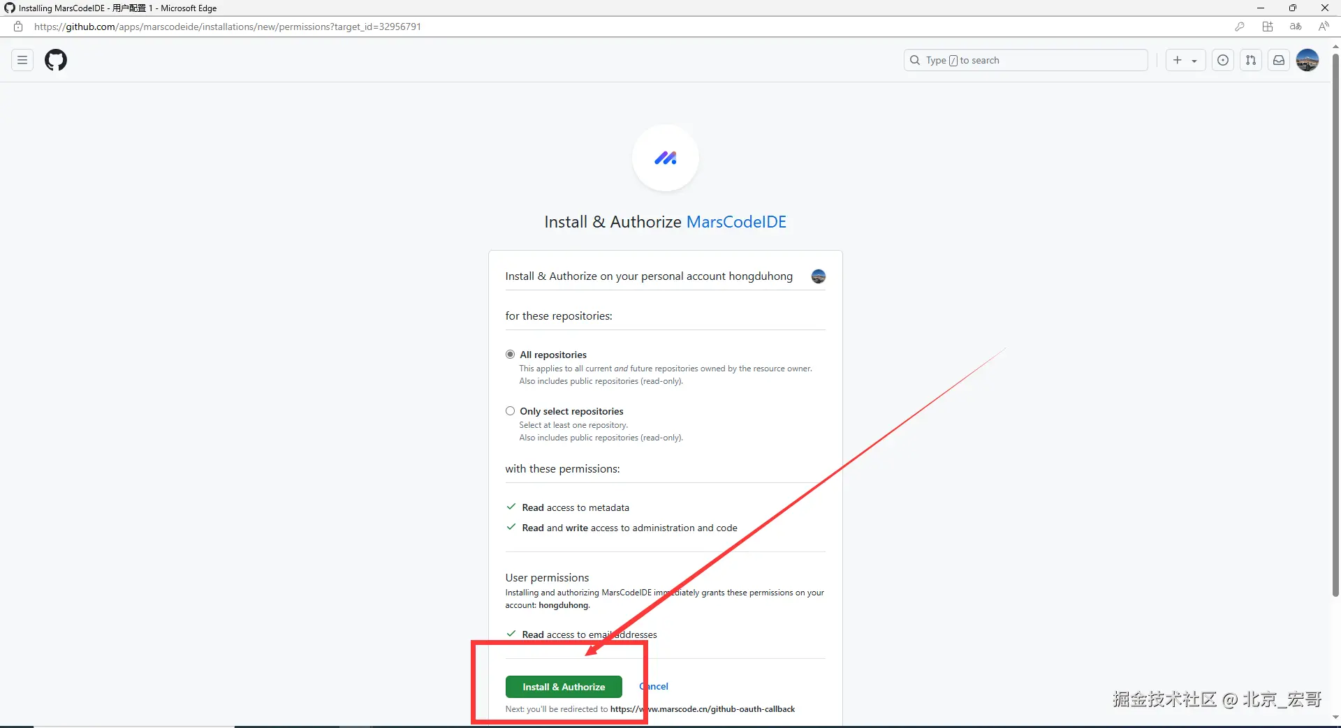7.登录GitHub账户后,进行授权,点击“Install & Authorize”,如下图所示: