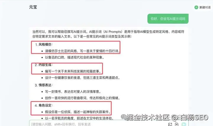 3、各自能力也不同,如果你真的学会了AIO,可能会比SEO更容易。因为SEO学习要么自学,要么看教程,而且还要弄内容。但是AIO的学习,你可以直接向AI学习。也可以用AI生成内容。我们以元宝(腾讯推出的AI大模型)举例,
