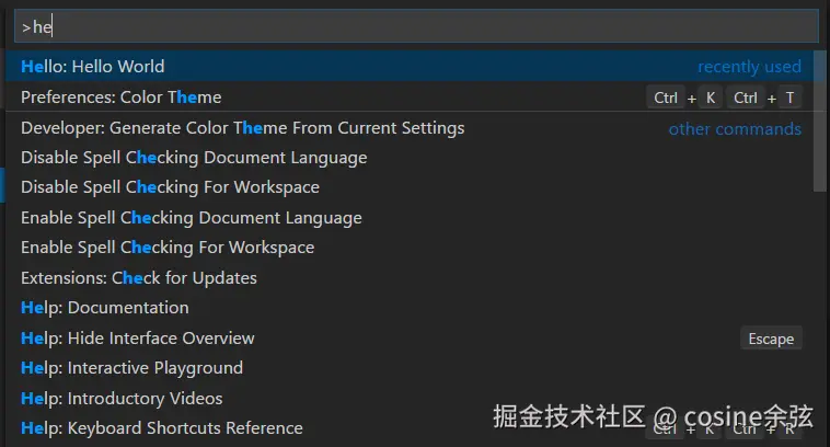 比如下文会提到的 viewContainer , vscode 会自动在目标位置渲染在 package.json 中注册的按钮。再比如命令的视图,当你按下 cmd+shift+p ,会在命令菜单中看到我们在 package.json 中注册的命令 title, icon.