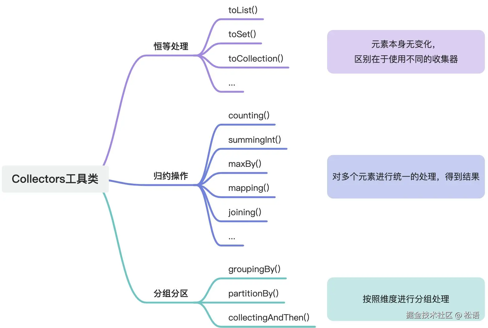 - Collectors 是一个工具类,它提供了许多静态方法,用于方便地创建常见的 Collector 实现。这些预定义的收集器可以满足大多数常见的收集需求,例如将流元素收集到列表、集合、映射等,或者进行分组、分区、规约汇总等操作。