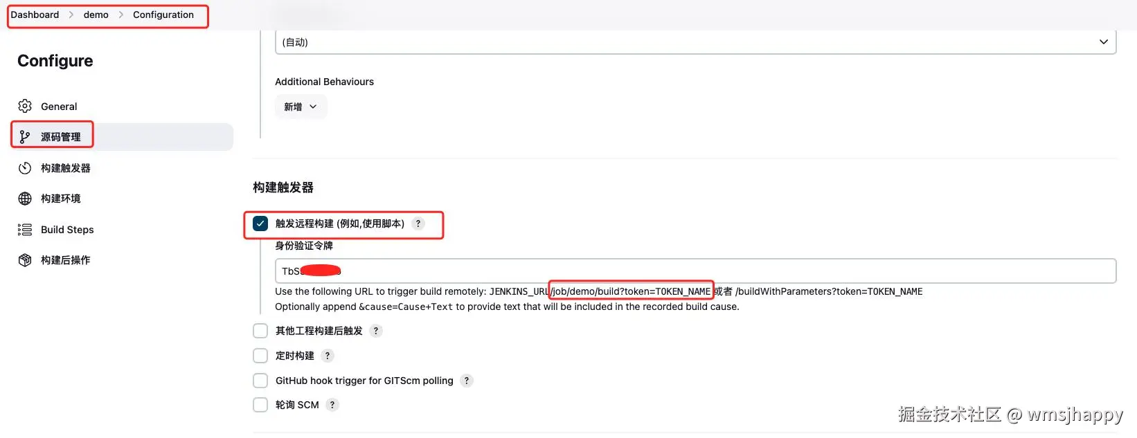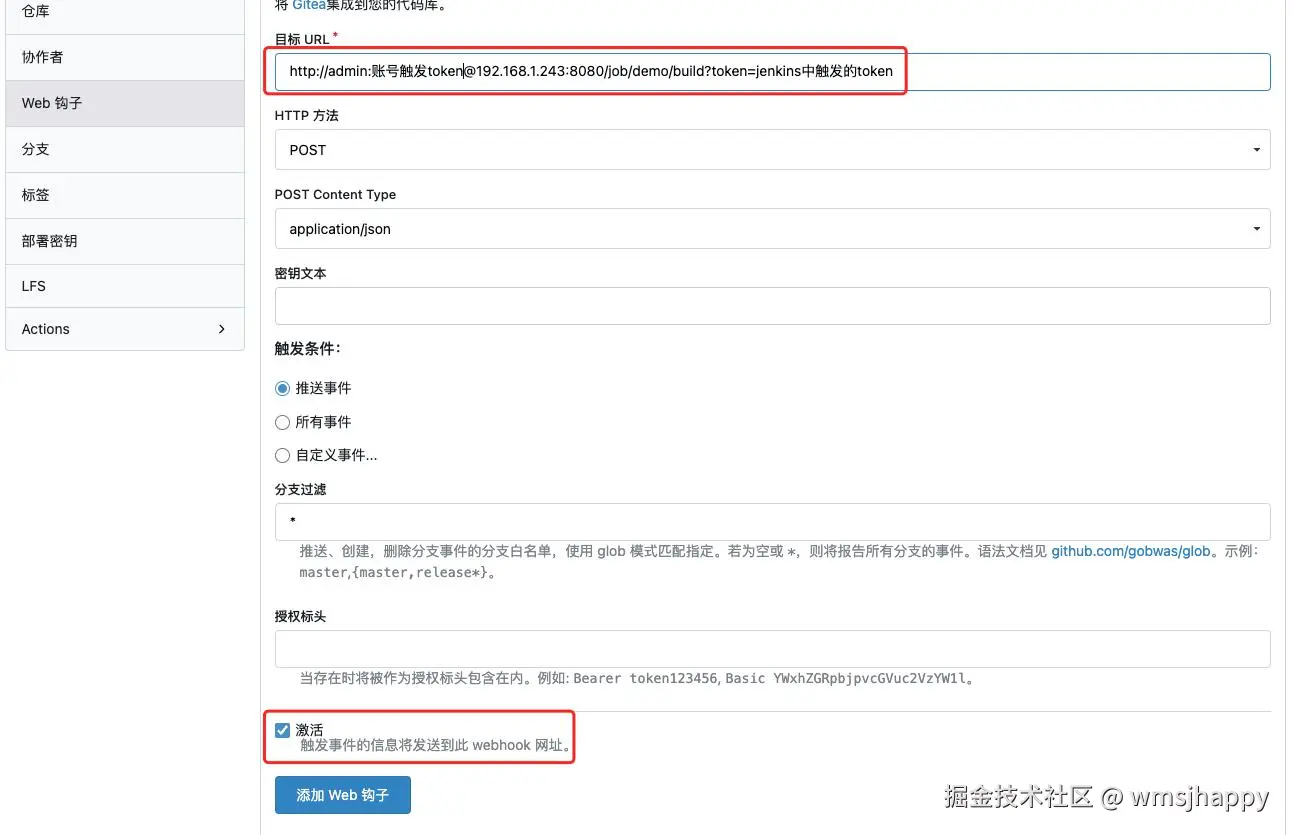 配置demo,启用触发构建并设置通信的token,需要记录token,在后面的gitea使用