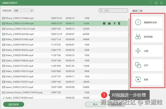 步骤4:在录制历史页面中,我们可以编辑媒体信息,并重新对视频进行剪辑、压缩、合并、转换等操作。